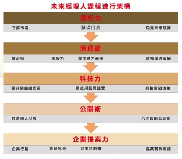 企業要生存必須要有獲利能力,而行銷業務人才便是企業主要獲利來源,頂尖的行銷業務人才身上具備了許多不可取代的能力,包含公關、專案企劃、電話行銷、領導、時間管理、人脈培養、服務管理…等等;但行銷業務的能力並非一蹴可及,這些能力必須經過長時間的訓練才有辦法培養出來。為此,我們大專行銷業務人才培訓營的課程,將分三個階段進行, 以產業趨勢為導向,協助求職者與企業能夠適才適所。