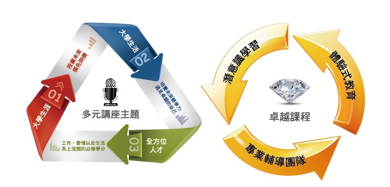主題系統化,扎實深學習 透過主題式的系列課程規劃,主攻六大軟硬實力、從個人談及關鍵團隊領導力,結合廣度與深度性,讓學員從自我出發,進而了解自己、相信自己、改變自己;於每半年一次的課程安排,向成功人士學習提早作計畫,強化時間管理力。 名人大匯集,拓展大視野 集結超過300多位來自多元產業、官方、學界傑出人士分享親身經歷,在這劇烈變動的世代迅速掌握有效資訊、了解真實實務經驗、開拓知識與視野格局,並找尋人生偶像,正所謂「人生有偶像才會有方向」,更進一步實現「模仿是成功的捷徑」! 講堂式對談,實戰性訓練 多元變化的教學方式,提供學員間相互互動,累積人脈,並擁有提問討論時間,與講師進行對話,促進經驗交流,提升思考邏輯能力;真實體驗式訓練,創造自我人生歷鍊,鍛鍊強化人格特質,養成關鍵態度。